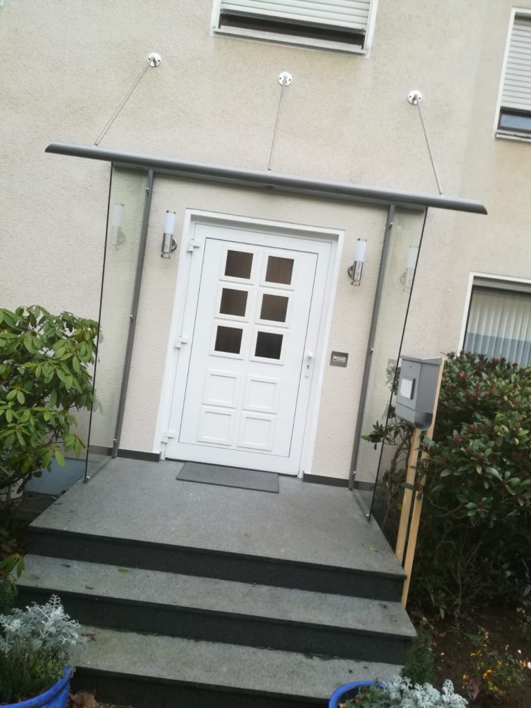 Klassische Konstruktionen oder filigrane Gestaltungen mit Glas und Edelstahl sind in vielen Formen machbar. Firma Ariane ist unser Hauptlieferant für Haustür-Vordächer. Eine schlichte Variante zeigt das nachstehende Foto .Rinne Wandprofil und Seitenrahmen nach Kundenwunsch im RAL Farbton Pulverbeschichtet