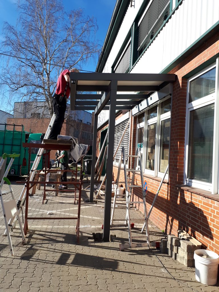 Firma Geiger lässt Vordach an einem Waageschalter aufstellen um Anlieferer vor Wind und Wetter zu schützen