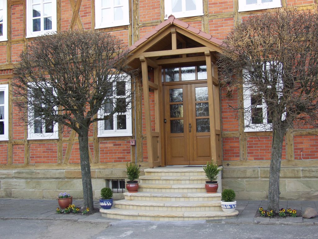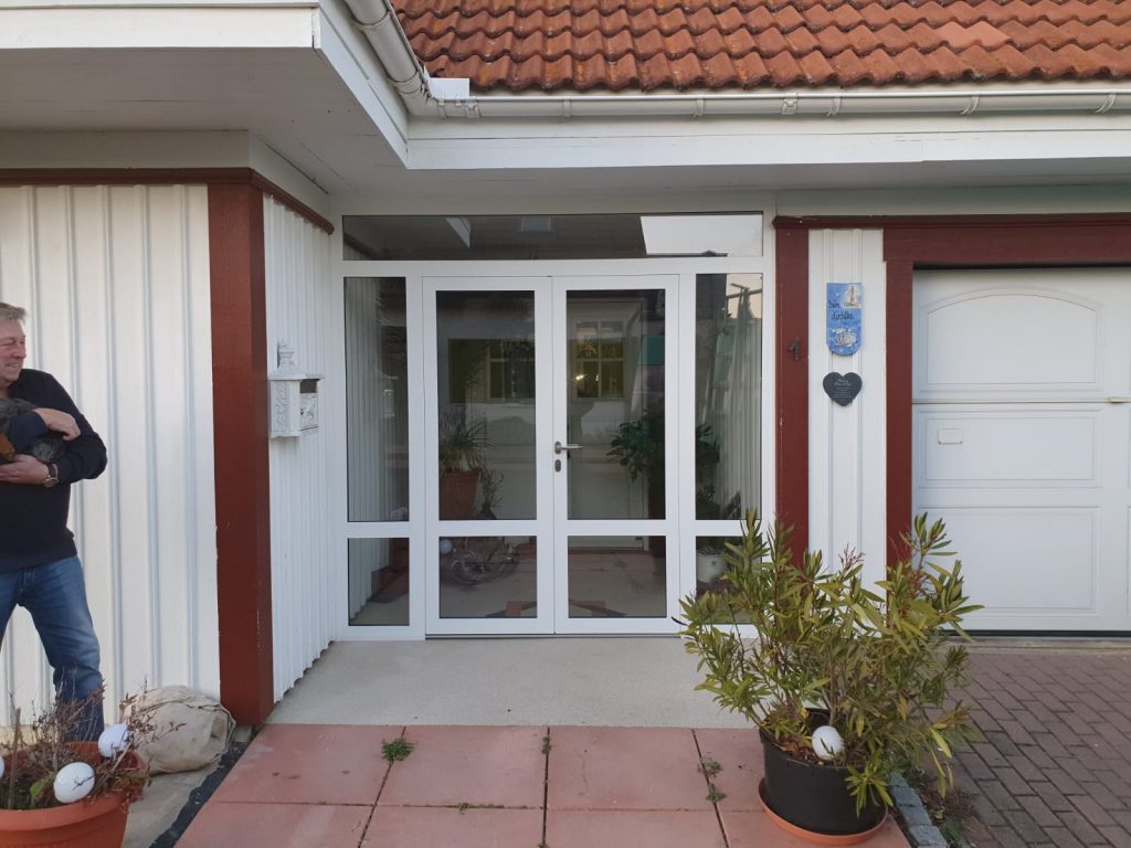 Ein Alu- Element mit einfacher Verglasung wird in eine vorhandene Niesche montiert und bildet so einen geschützten Eingangsbereich.