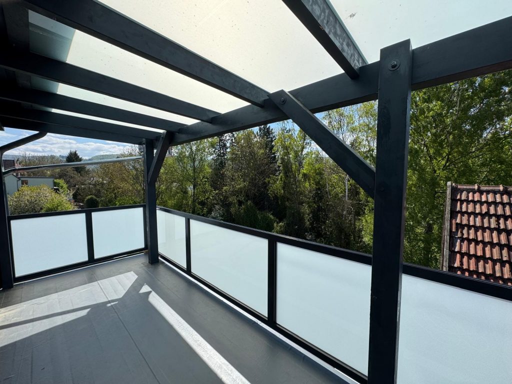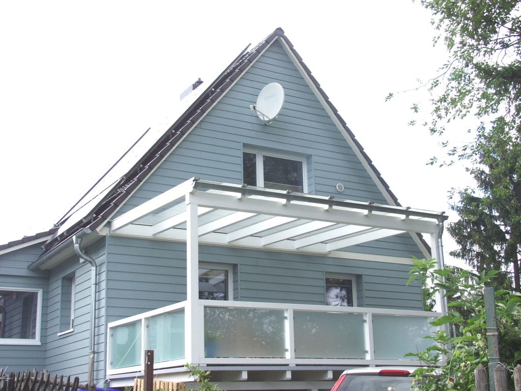 Terrasse aus Brettschicht-Kantholz hergestellt, weiß lasiert und mit satiniertem ESG Glas verglast. Die Dachscheiben liegen in Alu- Profilen mit Dichtungen so das kein Regenwasser die Sparren schädigt