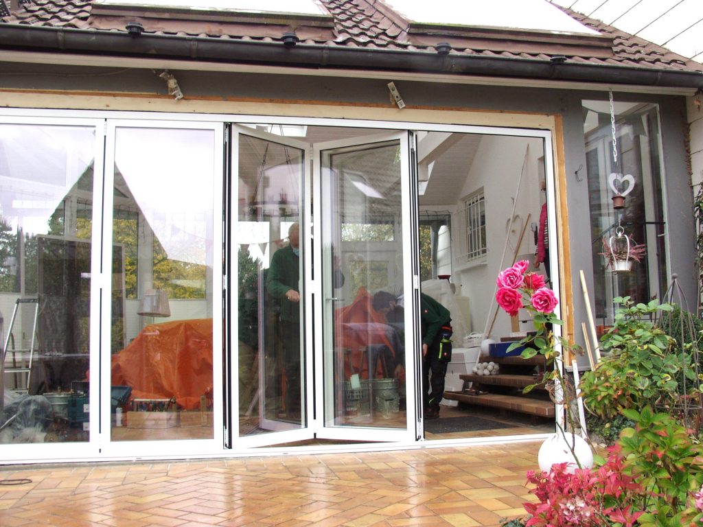 Glas-Falwände von Solarlux oder mehrläufige Schiebetüren in einfacher Verglasung sowie festverglaste Wandbereiche unter das Dach gestellt verbessern den Nutzen weiterhin.
