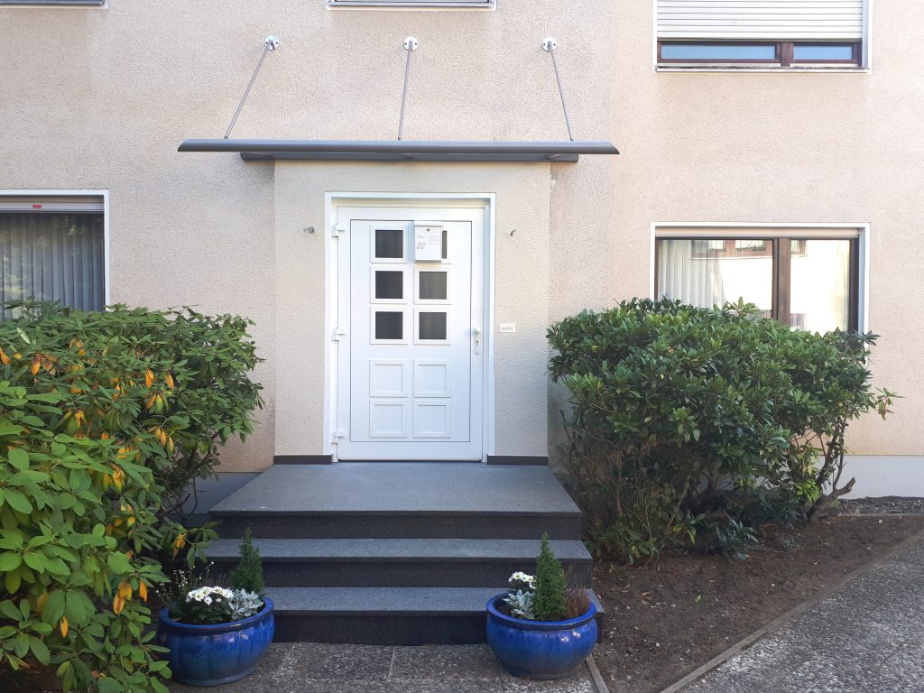 Klassische Konstruktionen oder filigrane Gestaltungen mit Glas und Edelstahl sind in vielen Formen machbar. Firma Ariane ist unser Hauptlieferant für Haustür-Vordächer. Eine schlichte Variante zeigt das nachstehende Foto .Rinne Wandprofil und Seitenrahmen nach Kundenwunsch im RAL Farbton Pulverbeschichtet